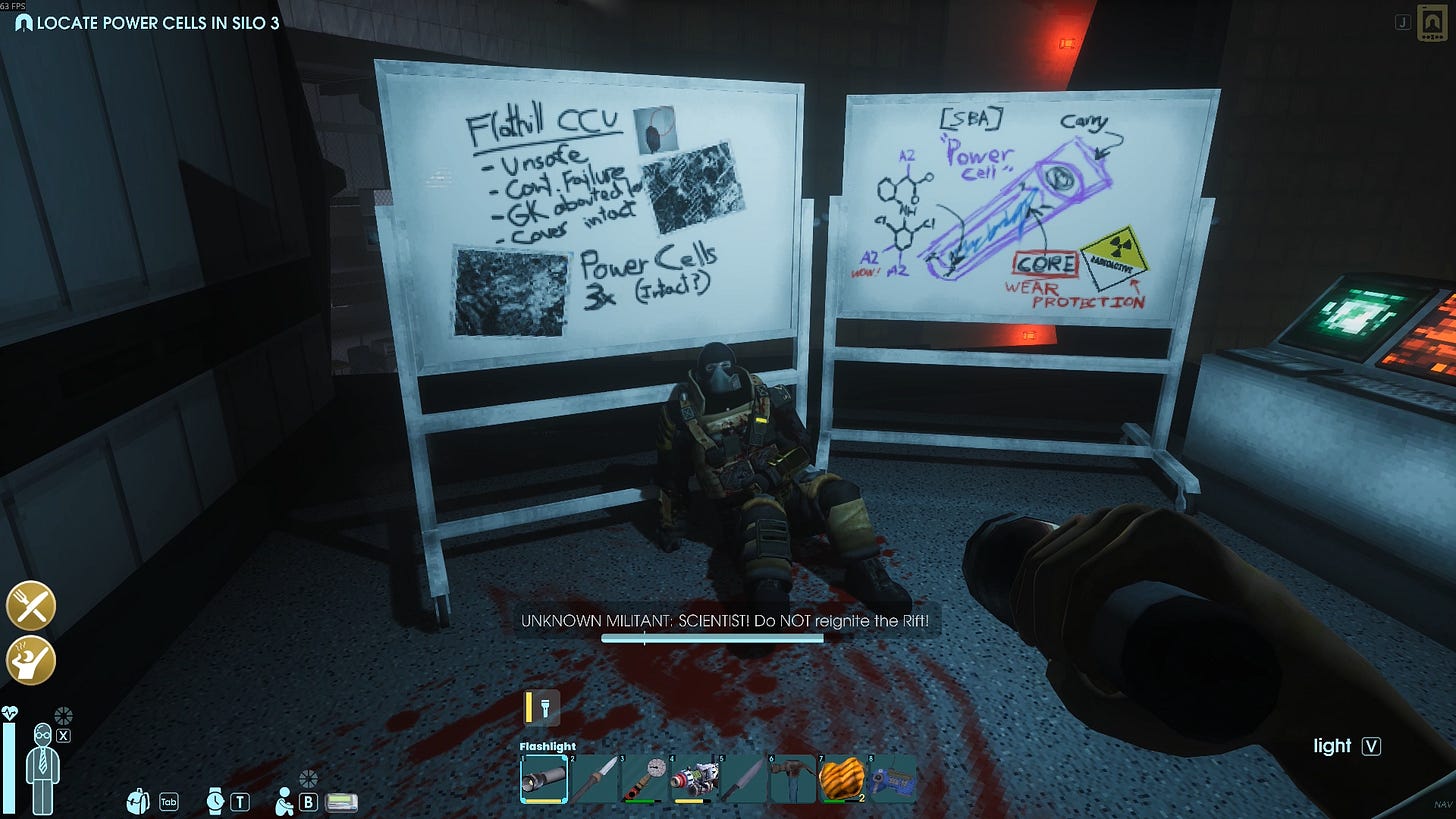 I didn’t opt to play the game in co-op, and while it is eminently completable solo, I do think it would probably leave a much stronger impression if you had someone to share the experience, the burden, and the exploration with. Unfortunately, unless you specifically go out of your way to set up a dedicated server, one person will have to host the world any time anyone involved wants to play. On a more positive note, the game has some nice features for immersion and playability, like proximity voice that can be supplemented with walkie-talkies, a device that lets you share discovered recipes, and the ability to rescue downed teammates. I also distinctly imagine having at least two players would alleviate the headache of a few enemy types, like the stupid fucking riot shield troops who just shuffle around facing you at all times with only their ankles exposed… until they crouch to hide their ankles.