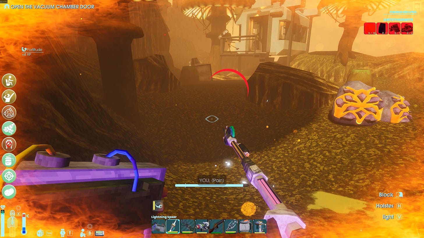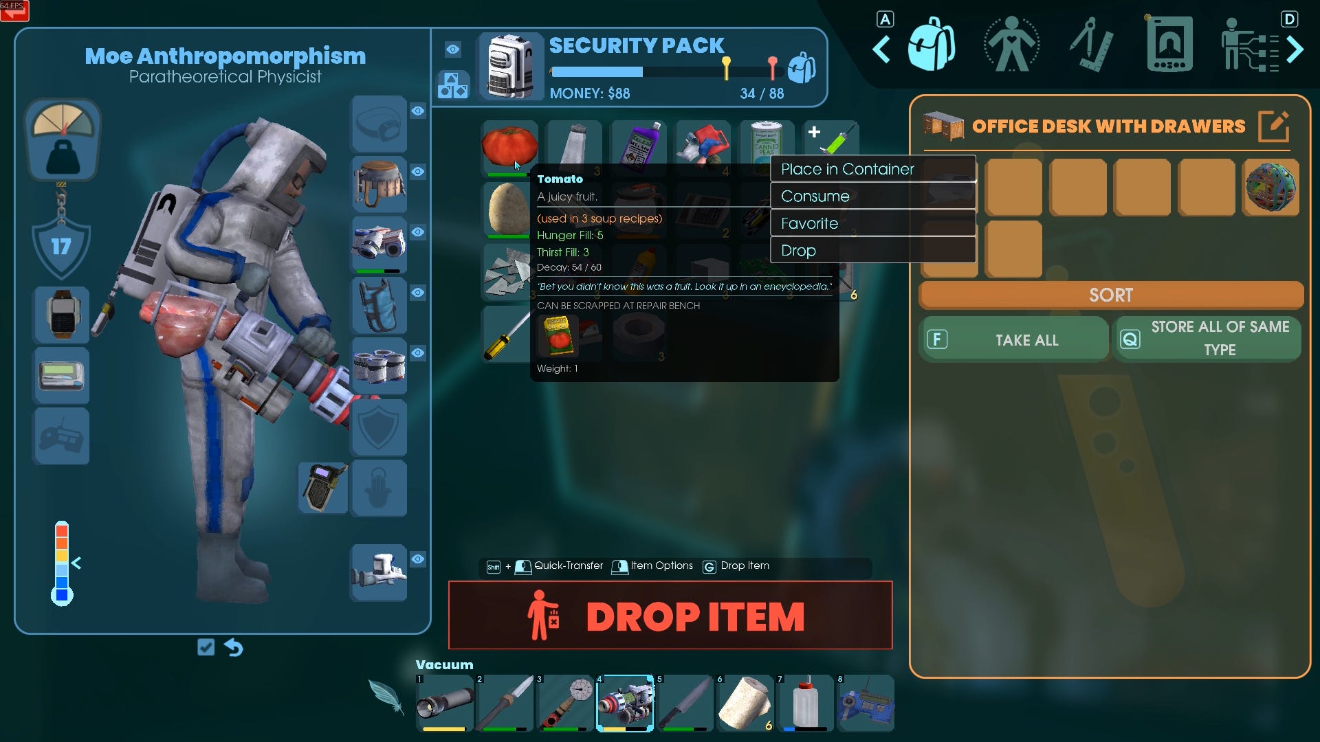 Of the survival mechanics, by far the most involved and least pointless is actually the hunger meter, as the game features a multitude of different sorts of edibles, raw bits of interdimensional aliens to grill, and dozens of recipes for gumbo. You can set up farming plots, carry whole refrigerators home, stock up on tomatoes, potatoes, canned peas, and even go fishing in the many pools of stagnant water throughout the facility [and multiverse] all to simmer up a couple jugs worth of soup. Many of the more involved foodstuffs come with some decent temporary buff, and learning the benefits of each new stew you’ve unlocked is a cute little side project as you’re winding down from a real outing, but nothing about it is gamebreaking or terribly essential.