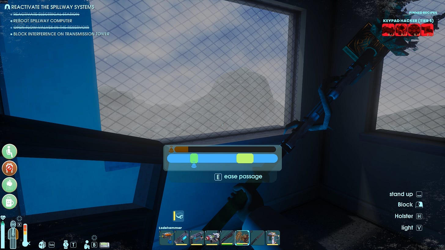 The last big feature of the game, beyond the combat, the base building, and survival, is the exploration, and thankfully, it’s good enough to render most of my complaints moot, or even redeem the otherwise underwhelming qualities of the gameplay. The sections of the facility you gain access to are impressively massive, fairly complex, and surprisingly physically grounded. One area is a series of tunnels and caverns, connected with roadways that you can cruise along in a hotwired forklift, with huge bridges, military camps, garages, a giant containment room filled with radioactive waste, and all kinds of side passages and shortcuts back to the various parts of the Offices sector. Another takes place along and around an enormous hydroelectric dam, with the reservoir beneath giving you access to tertiary facilities and outposts.