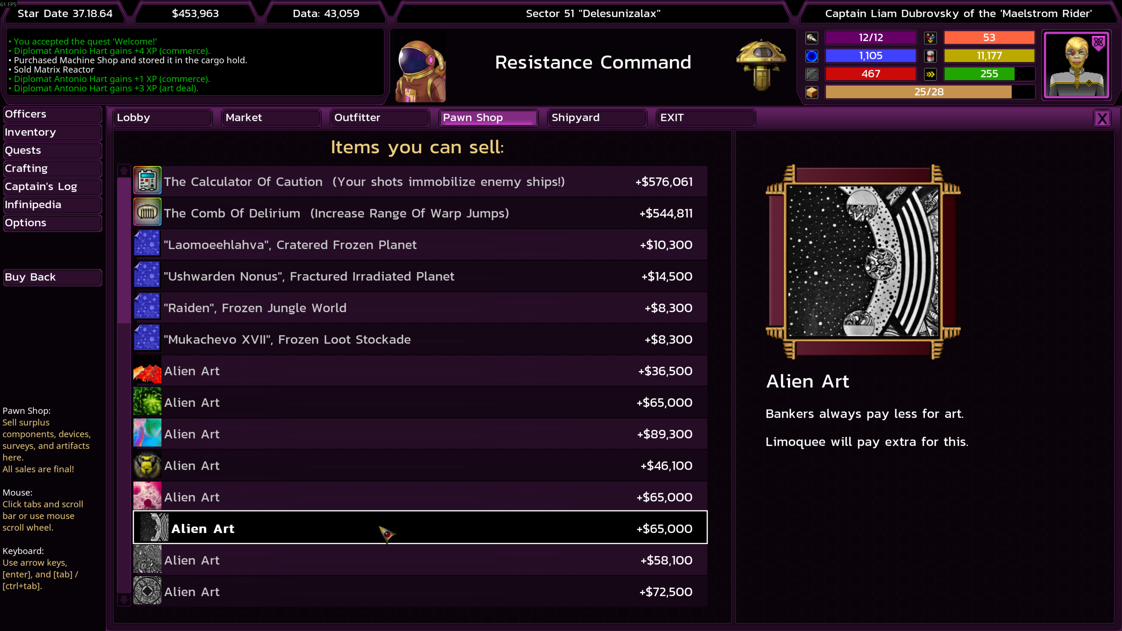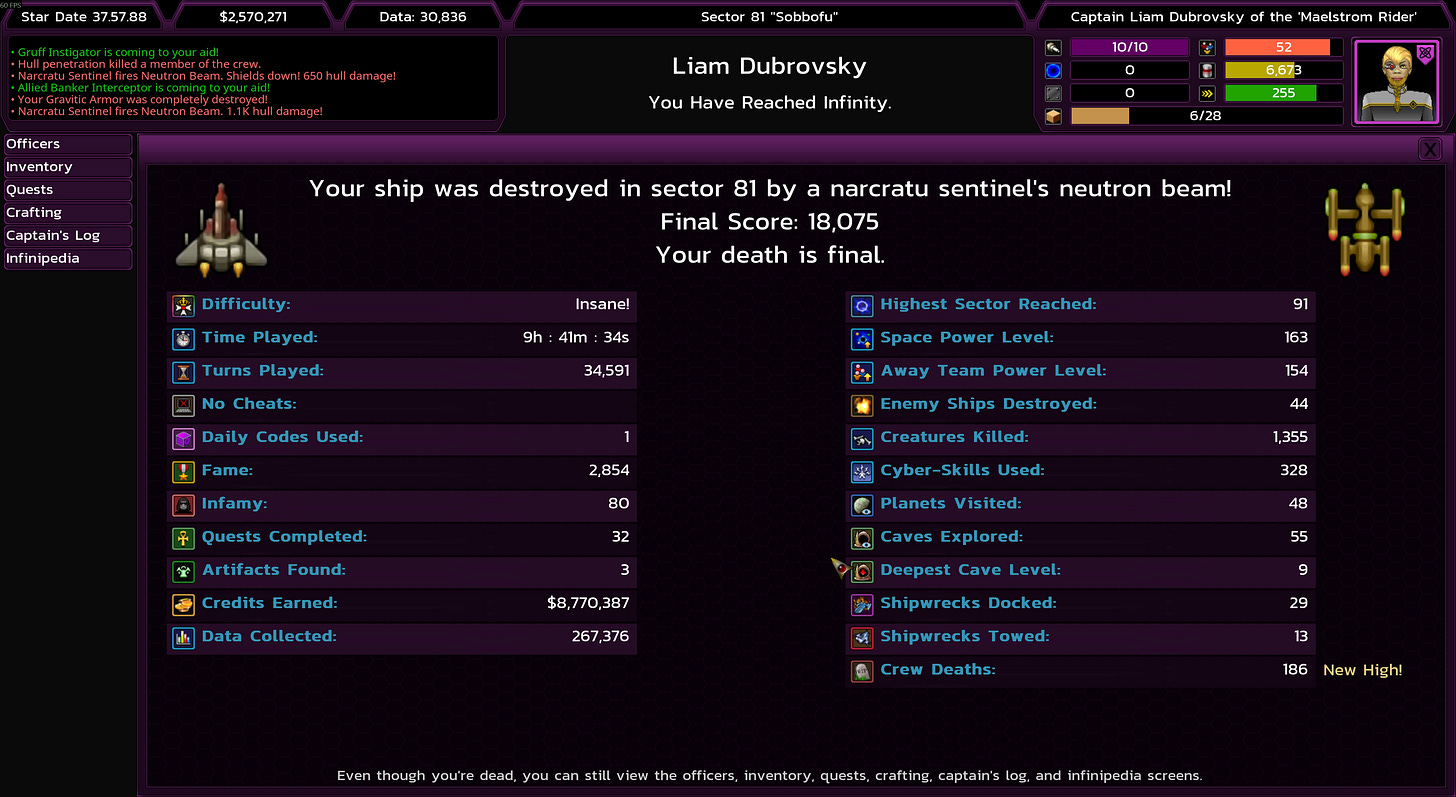 Approaching Infinity updates - my favorite roguelike has had two major updates in as many weeks, which added two things I noted as features I badly wanted last year. The first is alien officers, given to the four major races that don't have victory questlines, and each one is a unique class from all of the normal human officer types. The other is the ability to stuff current officers into cryo-pods, setting them aside to free up a spot on your crew so you can swap in a different class without having to totally delete a character you've spent multiple hours promoting.